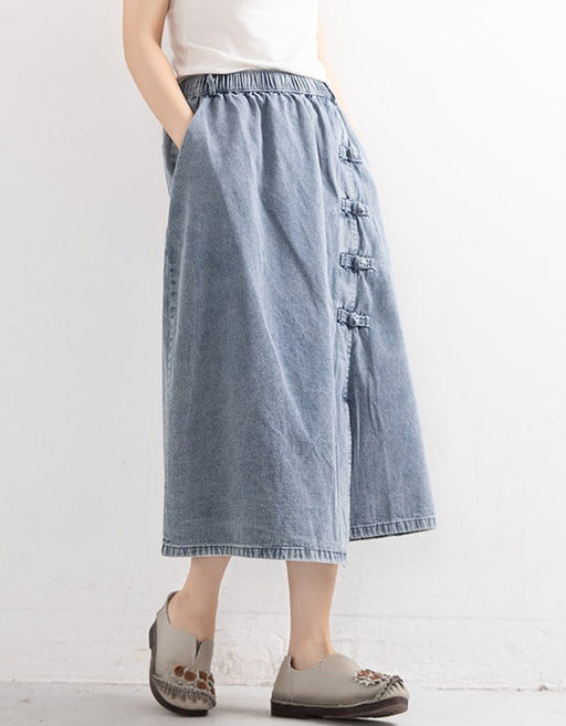 Buckle Hem Irregular denim mid-length Skirt. Front ethnic style buckle is the feature of this denim mid-length skirt. A versatile simple cut and c...