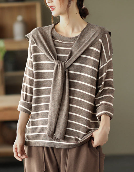Knit Striped Pullover Loose Long Sleeve Shawl Shirt