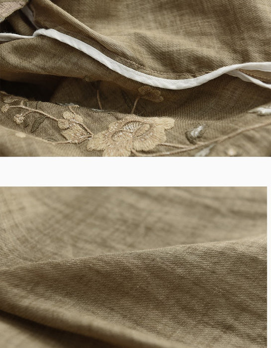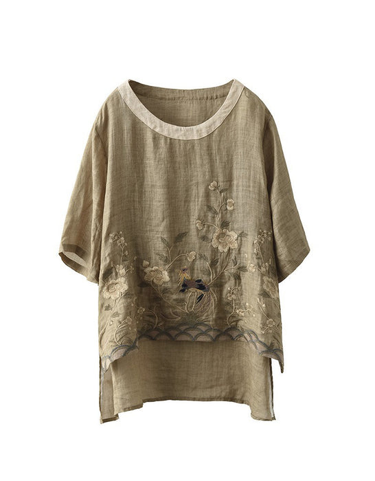 Linen Rounded Neck Embroidery Mid-sleeve Shirt