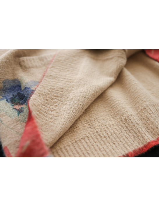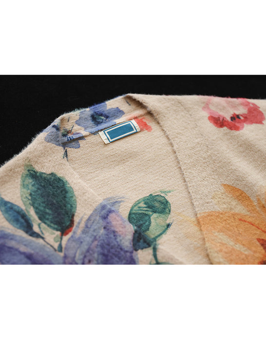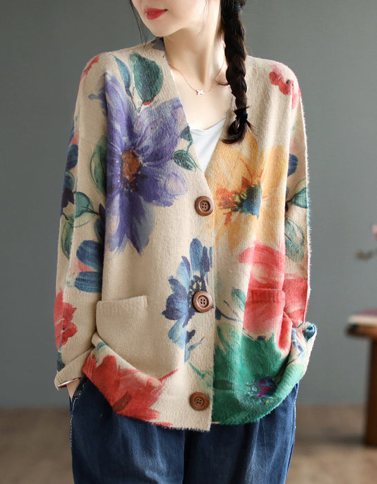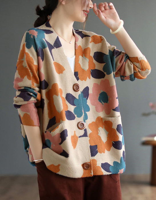 Vintage V-neck Floral Cotton Loose Knit Cardigan
