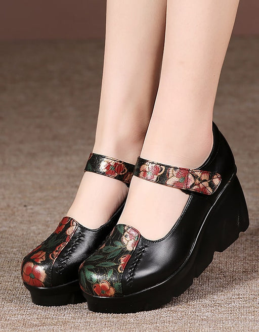 Handmade Leather Printed Vintage T-strap Mary Jane Shoes