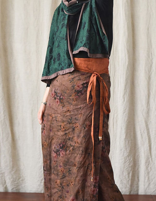 Falda cruzada de lino con encaje y estampado floral de cintura alta estilo retro