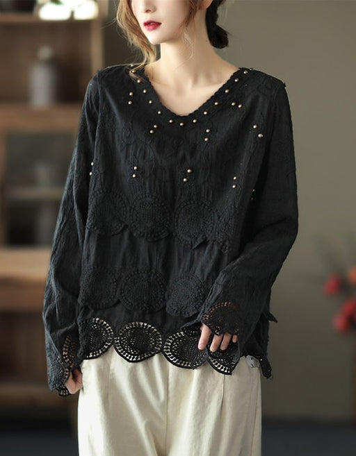 Ver todos los detallesCamisa retro bordada con cuello en V de ramio para mujer