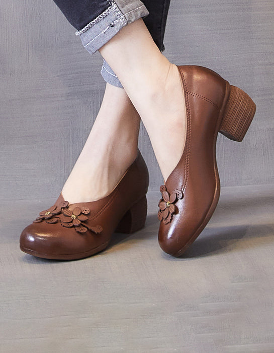 Zapatos de tacón grueso con flores en la parte delantera y de cuero estilo retro