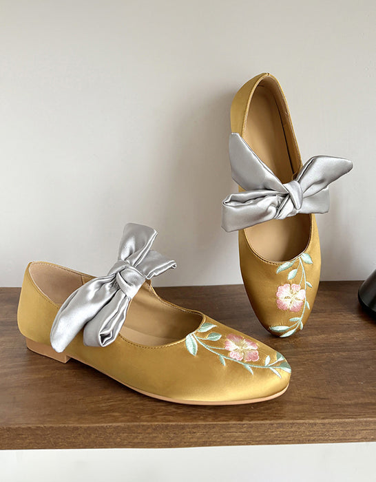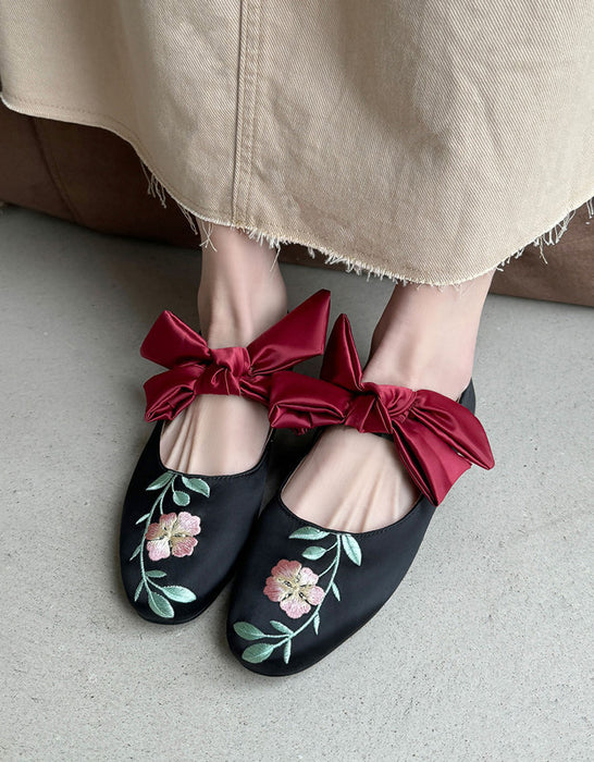 Zapatos planos vintage con lazo, correas de satén bordadas con flores