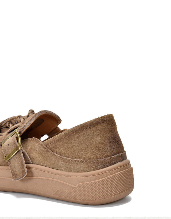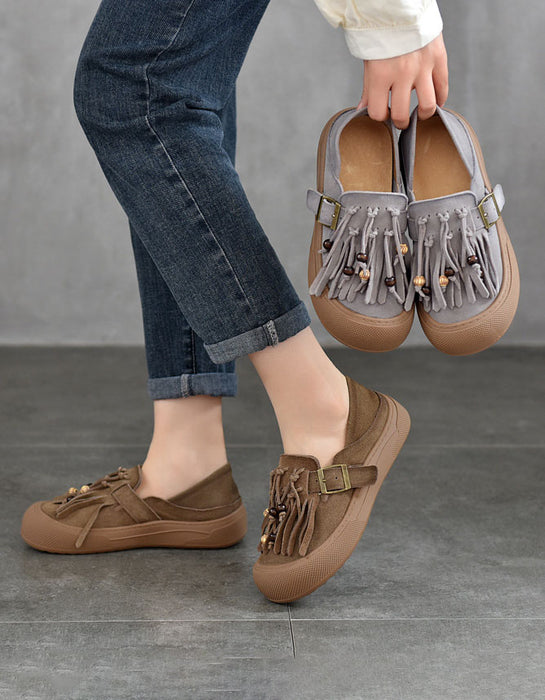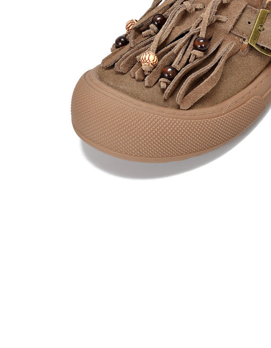 Genuine leather tassel round toe casual sneakers 2025 add a touch of bohemian style to your look. Made of premium leather, decorated with playful tassels and beads, with a secure side buckle and soft sole to ensure all-day comfort. These obiono's casual sneakers upper is made of top-layer cowhide and the sole is made of non-slip rubber sole. 3.5 cm heel and 8 cm shoe width. This suede flat shoes is ideal for casual outings or daily wear, combining fashion and practicality. Pair it with jeans or a skirt to create a relaxed and natural look without losing your personality.
