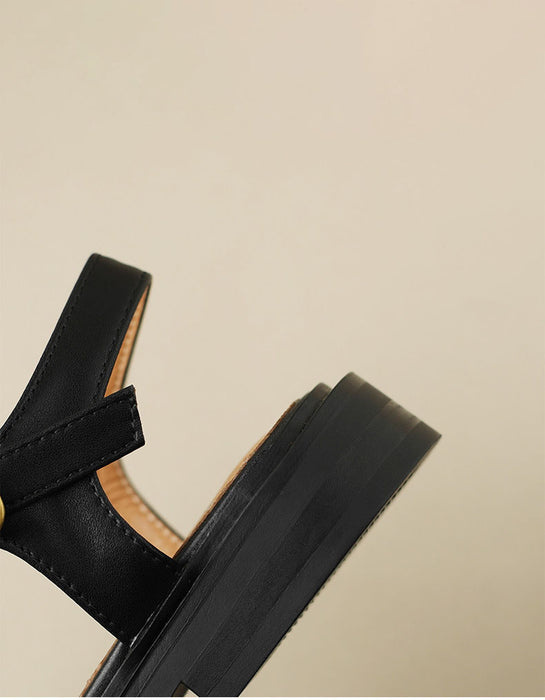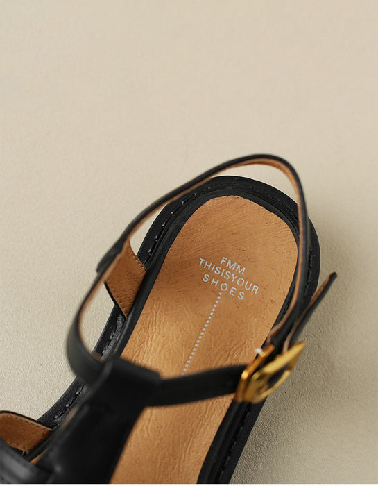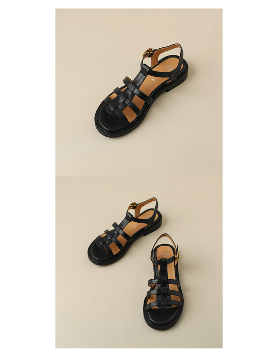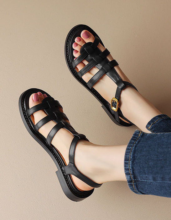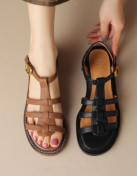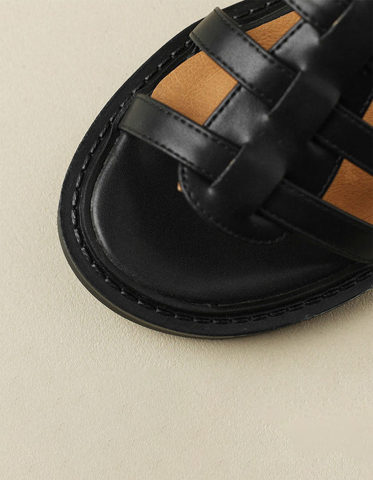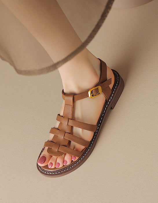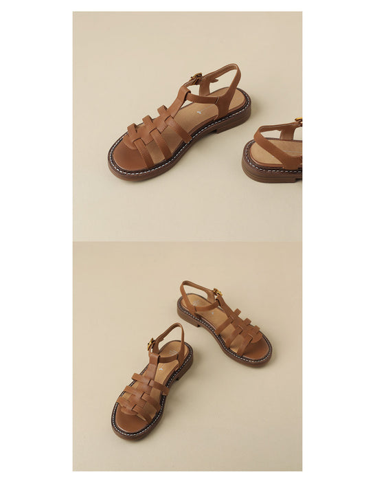 These T-strap vintage Roman sandals feature a stylish, modern design with interwoven straps, available in classic brown and black leather. The sandals are equipped with a comfortable, padded insole and a secure buckle closure, ensuring a perfect fit. 2.5cm heel height. The durable TPR sole provides stability and support for everyday wear. Ideal for casual outings or relaxed summer days, these obiono strappy flat sandals offer a versatile look that pairs well with dresses, shorts, or skirts, adding a chic touch to any outfit.